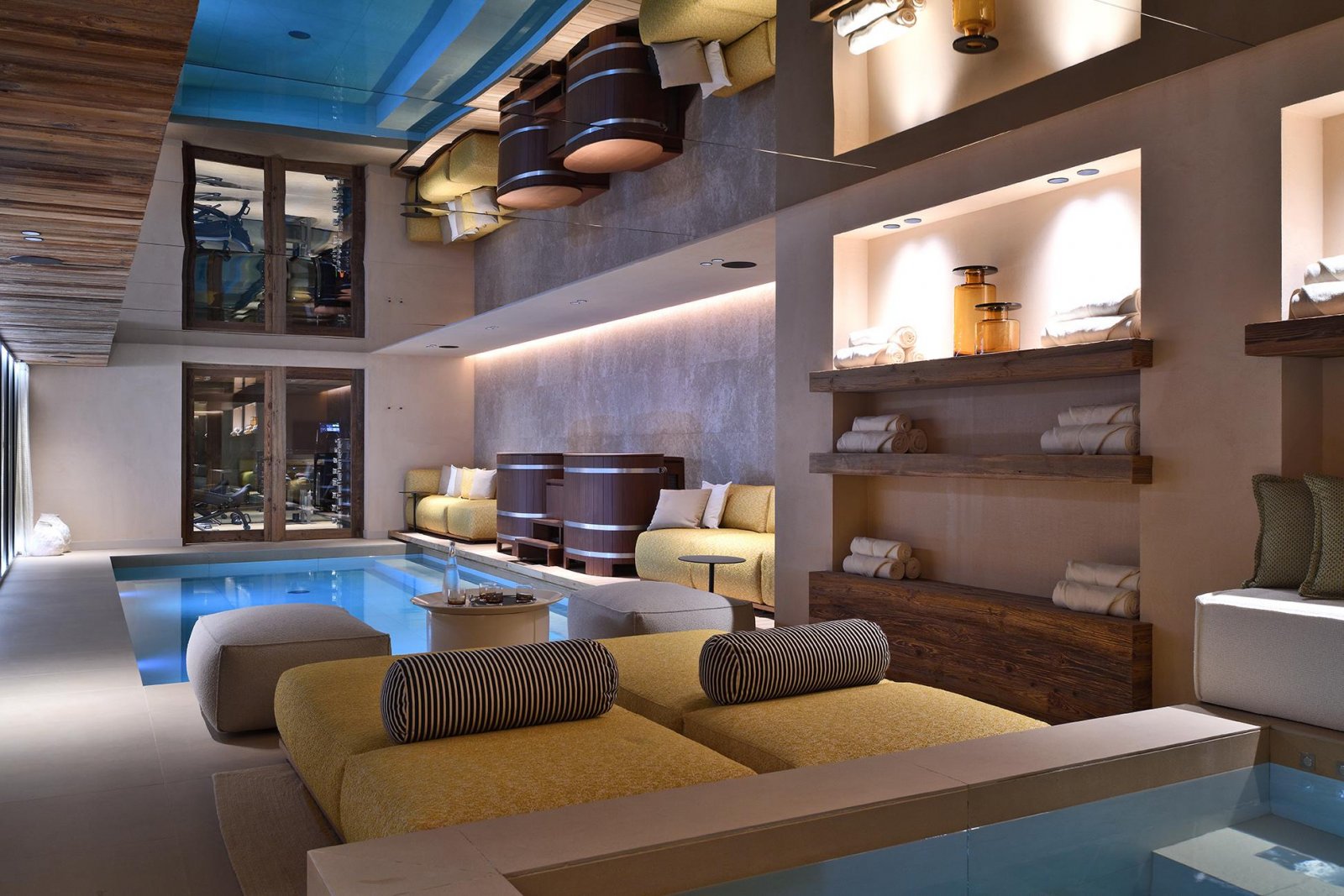 Оздоровительные удобства действительно исключительны: частный крытый бассейн, джакузи, полноценная спа-зона с сауной, хаммамом, массажным кабинетом и полностью оборудованный тренажерный зал — все, что нужно, чтобы расслабиться и зарядиться энергией. Гостиные зоны уютные и просторные, их преимуществом является центральный камин, открытая планировка и большие панорамные террасы.