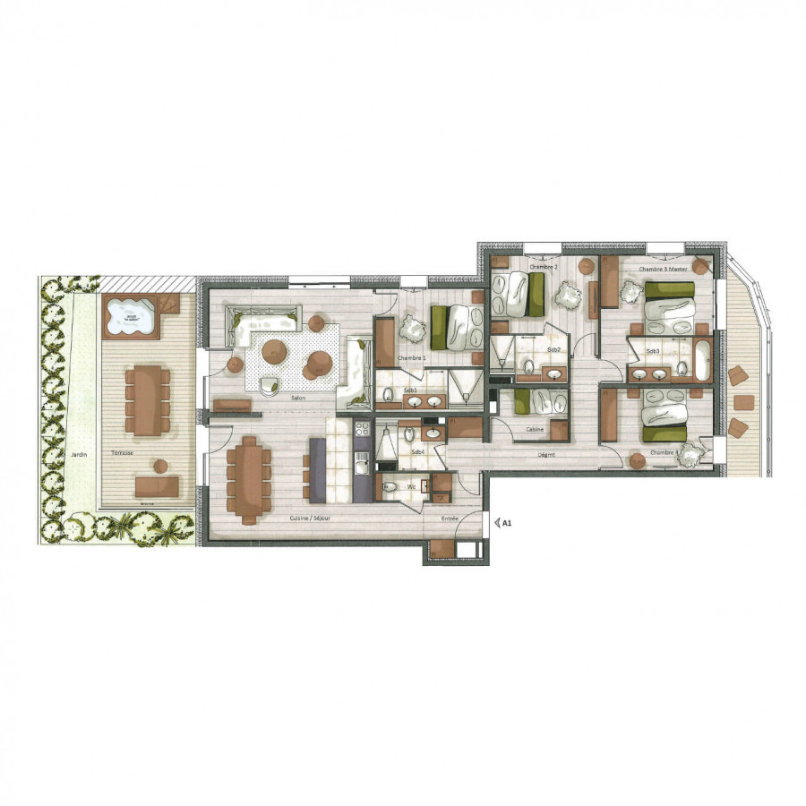 В апартаментах есть четыре спальни с двуспальной кроватью, комната в стиле «кабина» с двухъярусной кроватью, а также четыре ванные комнаты. В гостиной есть зона отдыха с телевизором, полностью оборудованная и функциональная кухня, большая терраса и ещё один балкон. В апартаментах также есть бытовая техника, такая как посудомоечная машина, кофемашина Nespresso и т. д.
