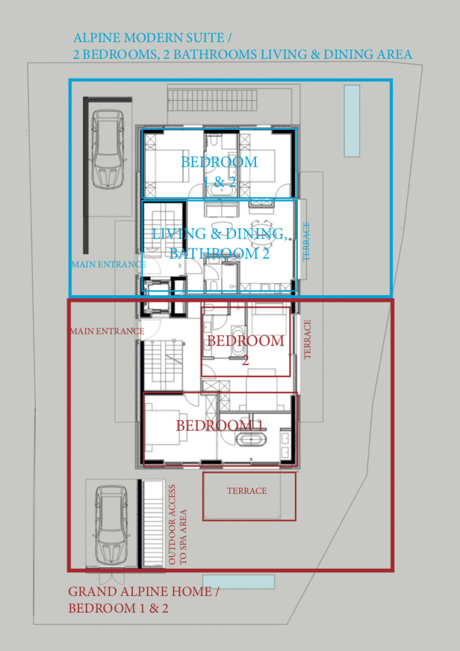 - 2 спален (прибл. 30 м2) с собственными террасами и ванными комнатами с душем и ванной,