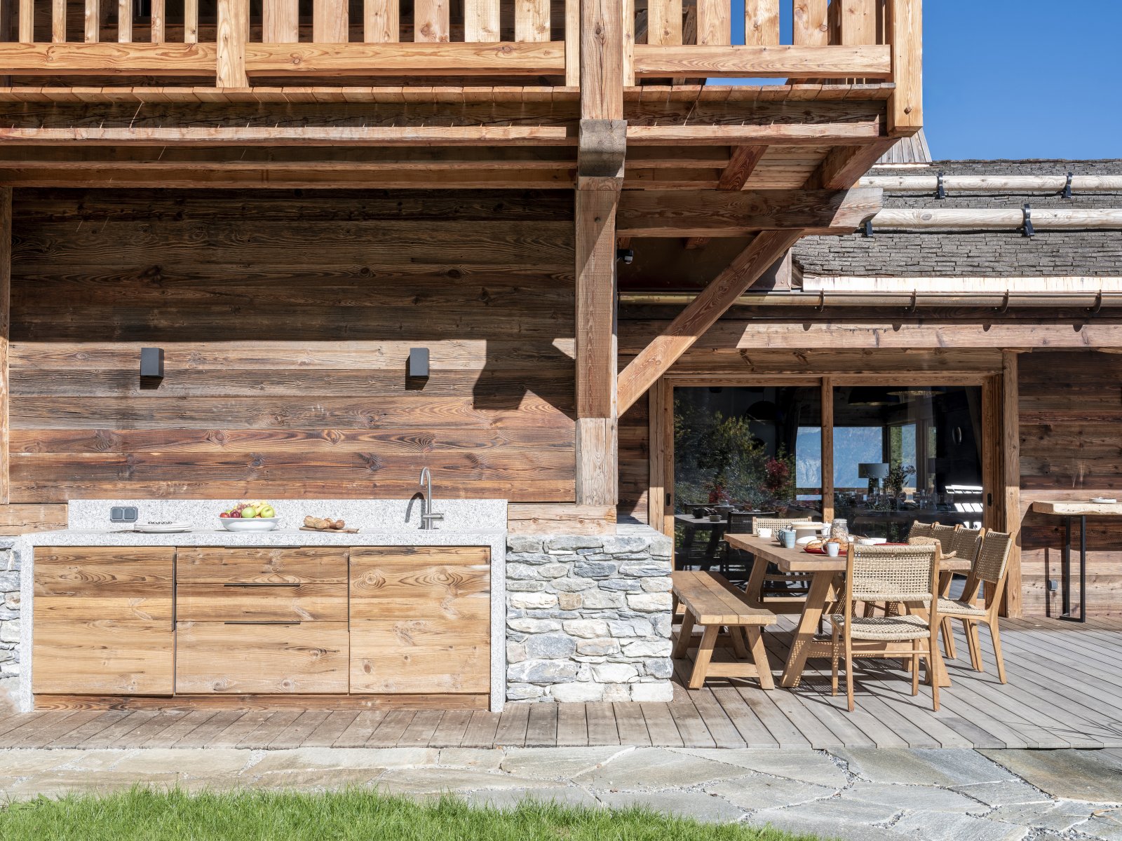 Эта открытая жилая зона воплощает в себе суть исключительного альпийского отдыха: полностью оборудованная летняя кухня, уютная обеденная зона и джакузи с подогревом на открытом воздухе для незабываемых впечатлений на фоне горных вершин.