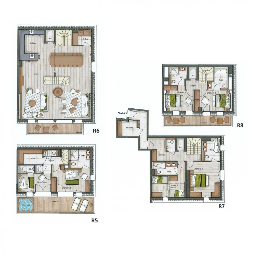 Шале K расположено на четырёх уровнях курорта Falcon, имеет площадь 261 м² и вмещает до 14 гостей, из которых максимум 10 взрослых.