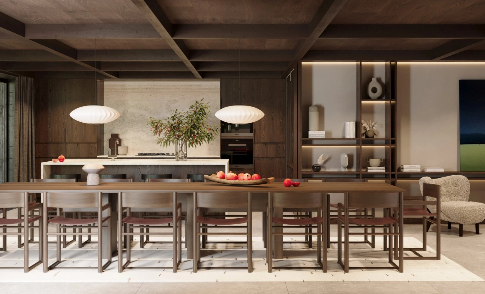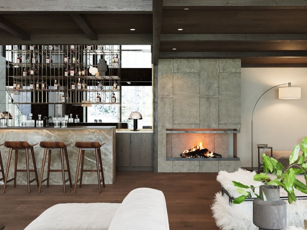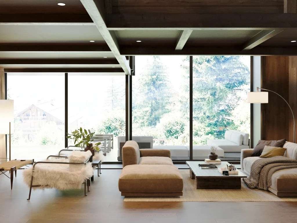 Дизайн всего шале спокойный и светлый, с акцентом на современную открытую планировку, отделанную высококачественными натуральными материалами. Теплое дерево, камень и бетон сочетаются с текстурными отделками и мягкой, землистой палитрой, создавая интерьеры, которые выглядят сбалансированными, вневременными и тесно связанными с природой.