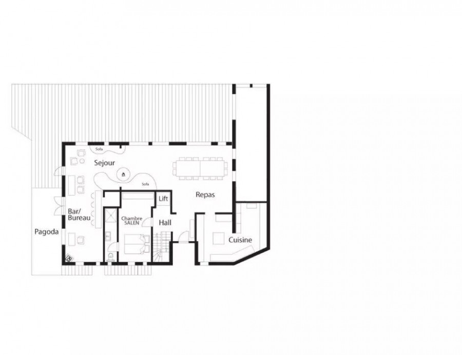 Столовая, гостиная и офисные помещения выходят на террасу площадью 250 м2. Она обращена на юг и запад, очищена от снега и оснащена тиковой мебелью и обогревателями террасы, а также имеет крытую площадь с одной стороны.