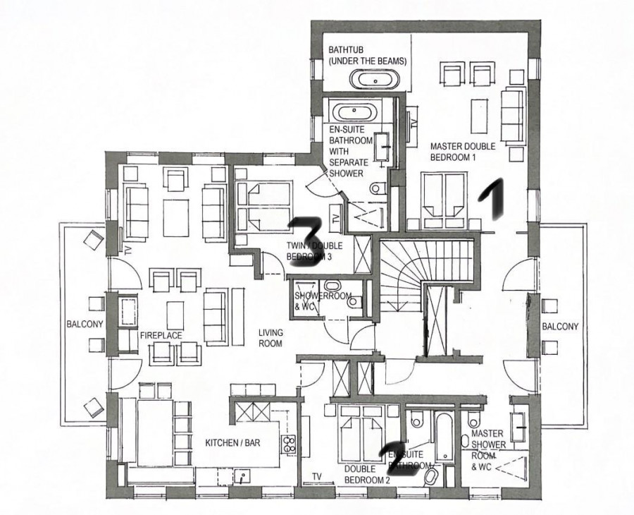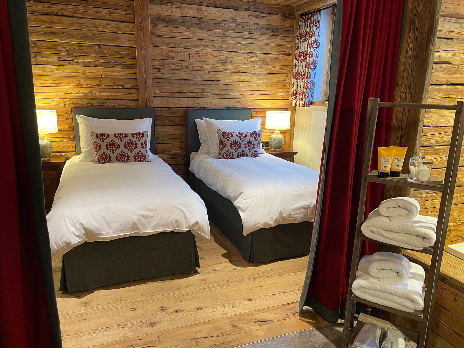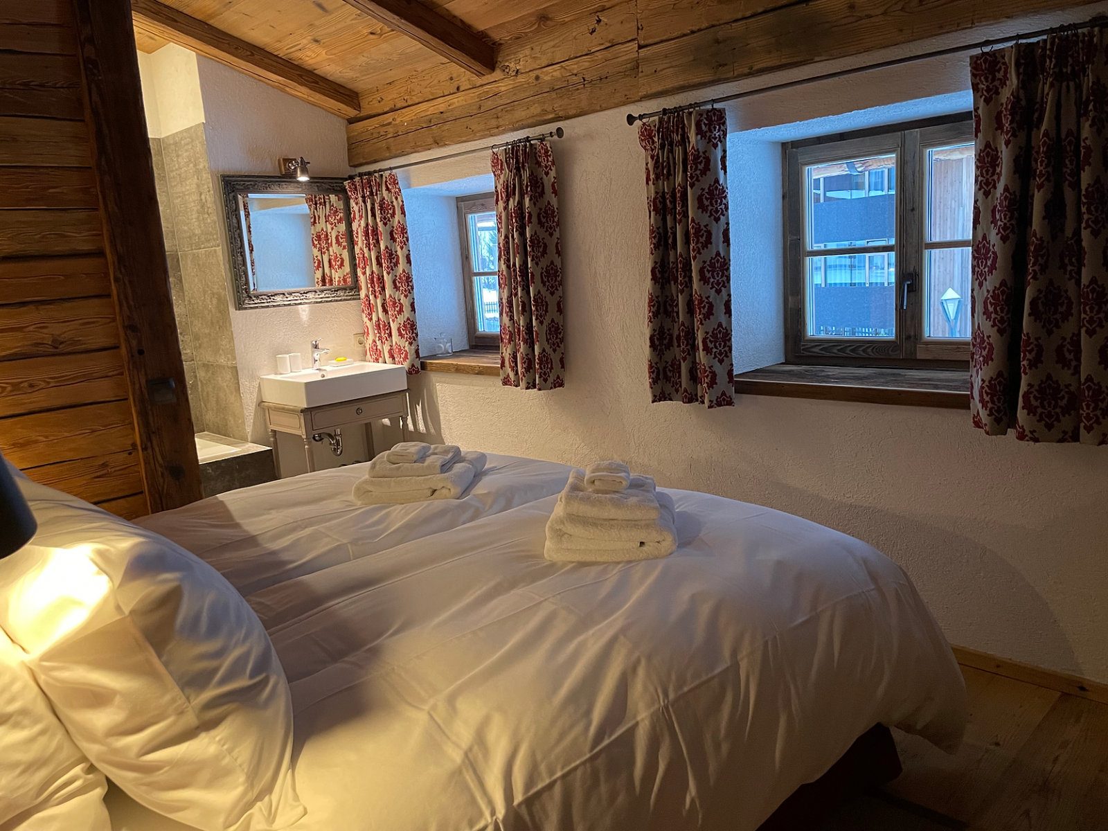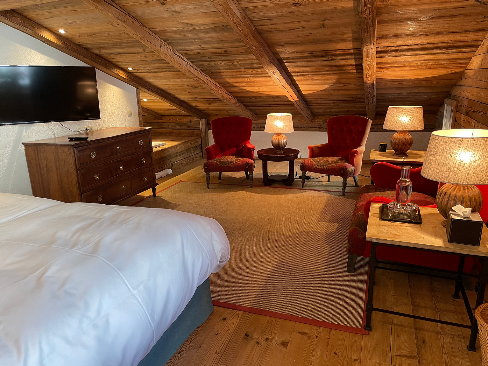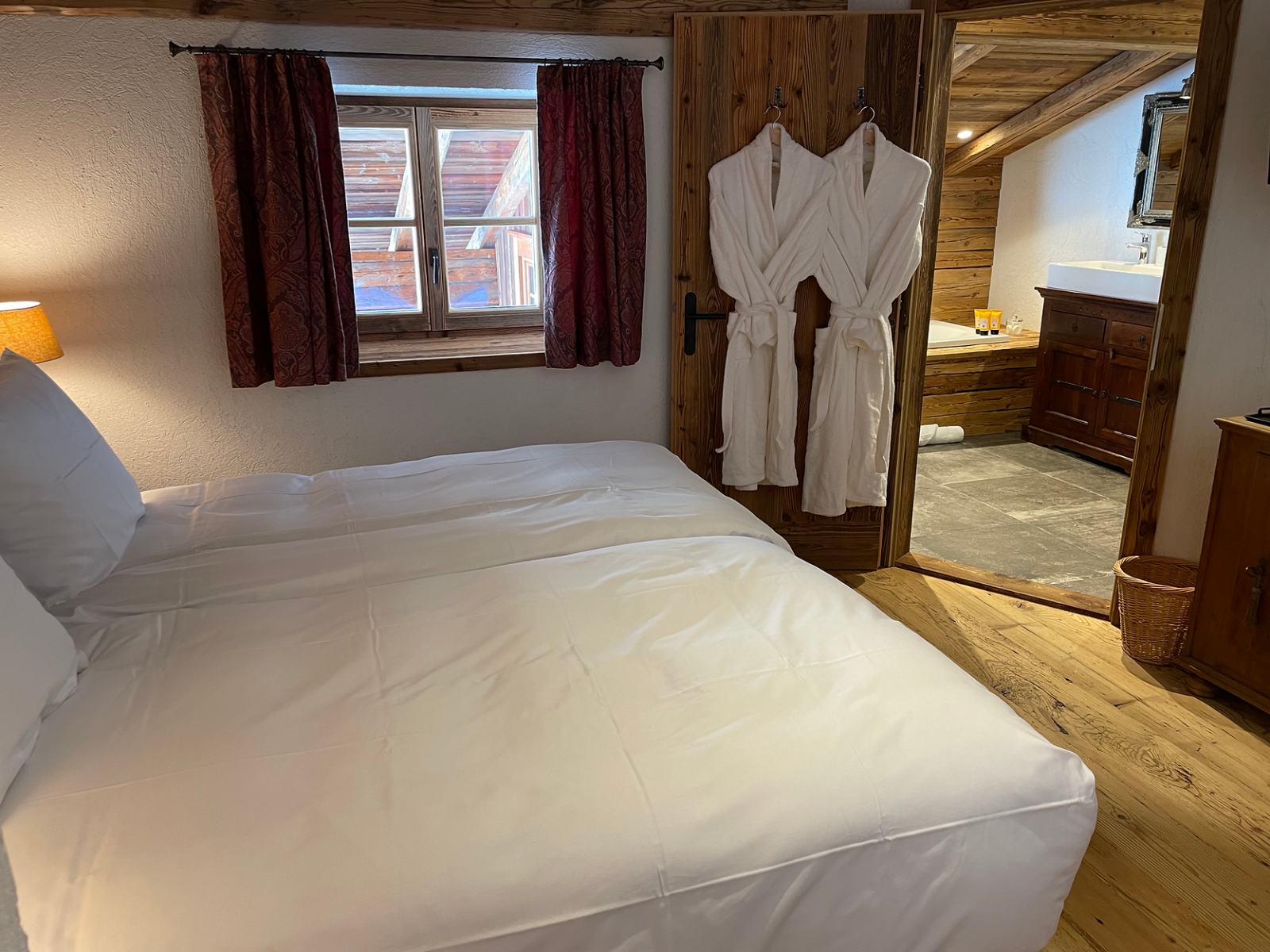 Главная спальня расположена на карнизе шале. Есть большая спальня с двуспальной кроватью с кабинетом, гостиной и ванной. Через частную лестничную площадку расположена примыкающая к ней душевая комната. Из этой комнаты открывается прекрасный вид.