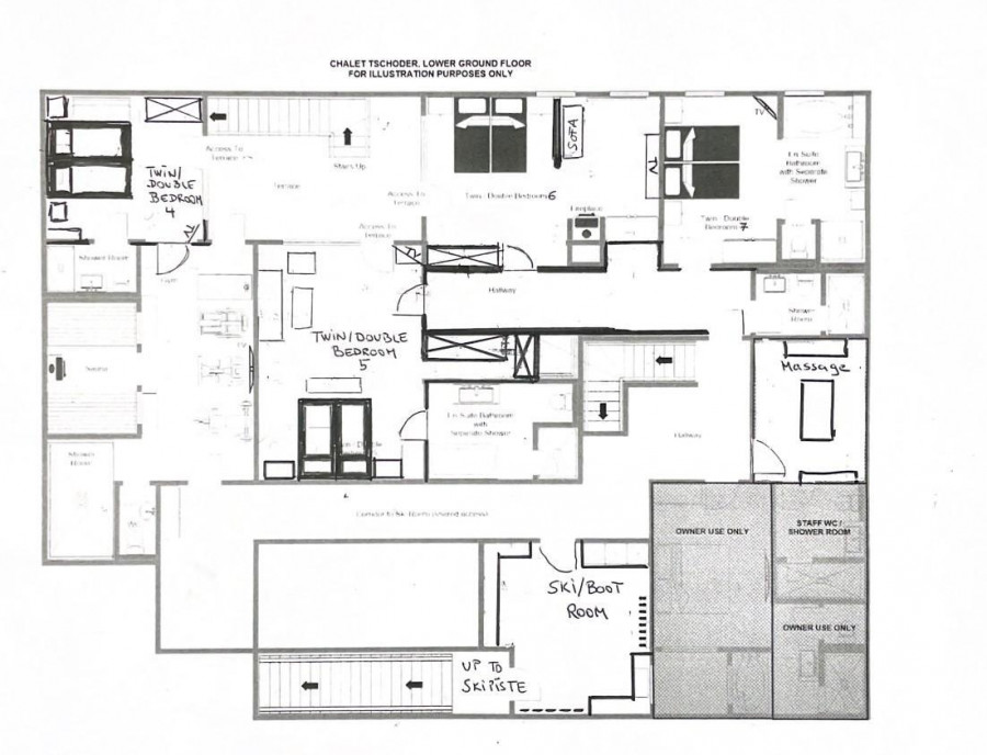 На нижнем первом этаже вы найдете три спальни с двумя односпальными кроватями/двумя односпальными кроватями. В первой из спален есть прекрасная ванная комната открытой планировки и отдельный душ, во второй спальне есть ванная комната с отдельной душевой кабиной, а в последней спальне есть отдельная душевая комната, пересекающая коридор. На этом этаже также находятся развлекательные и спа-центр.