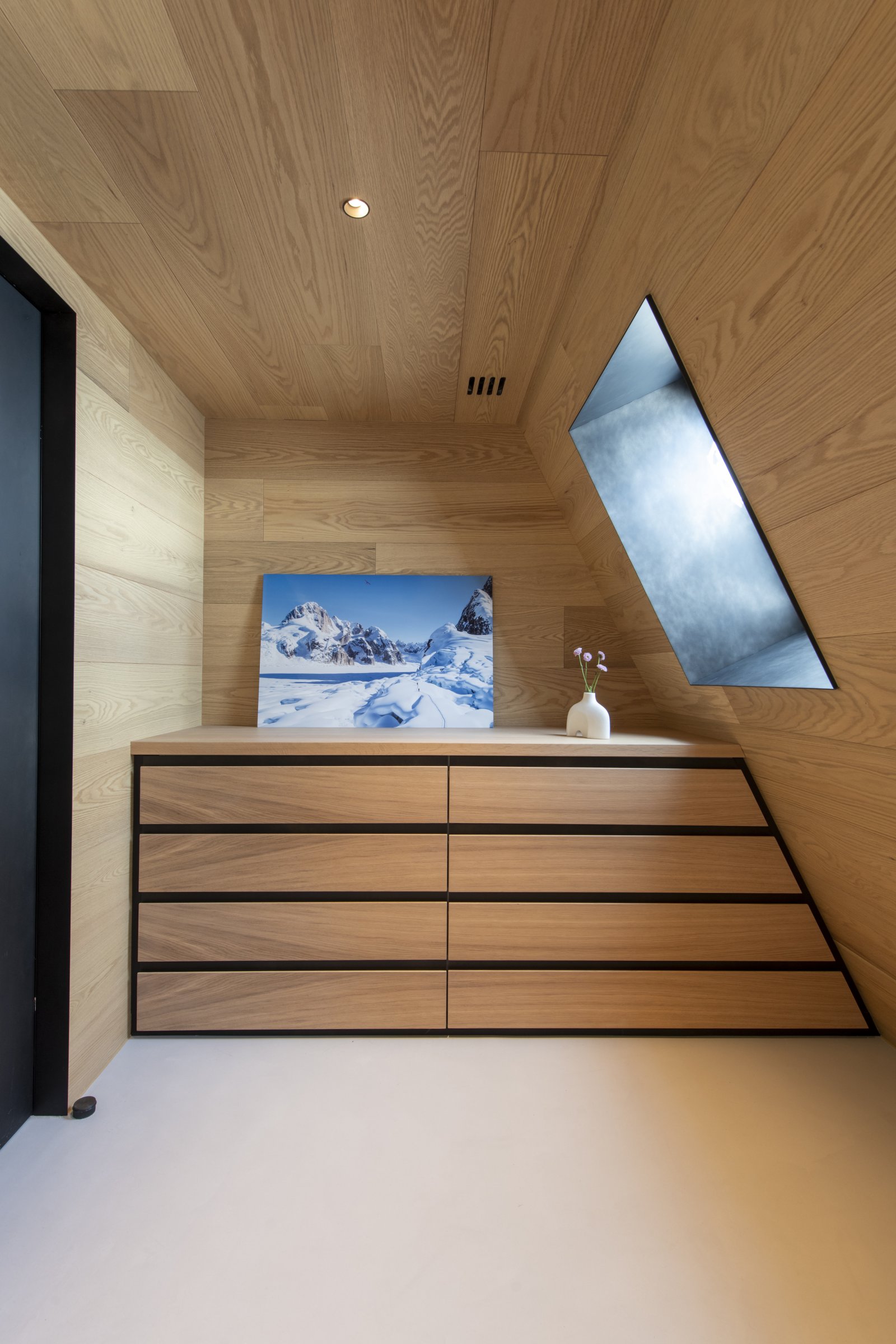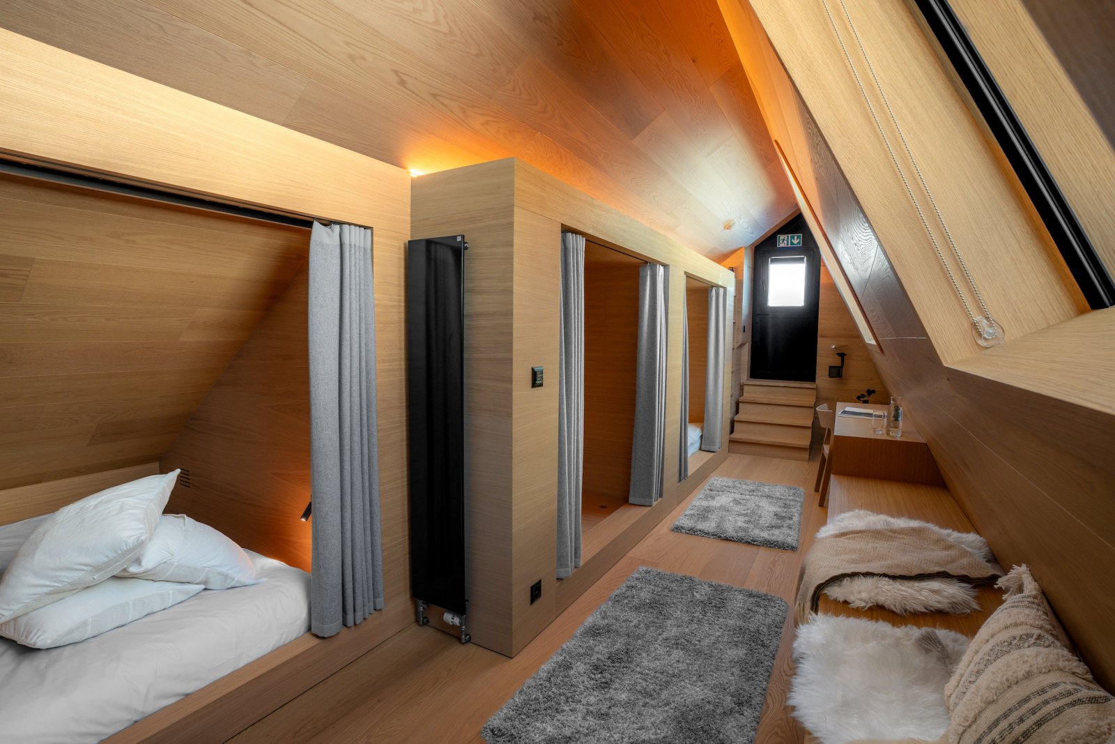 Три спальни с двуспальными кроватями занимают основной этаж; главная спальня имеет отдельную ванную комнату и вид на восход солнца над Монбланом. Наверху, в уютной капсуле, могут разместиться шестеро детей или подростков в уютном уединении. Постельное белье из натуральной шерсти, светонепроницаемые шторы и бесшумная вентиляция гарантируют глубокий сон, необходимый для утренних патрульных вылазок.
