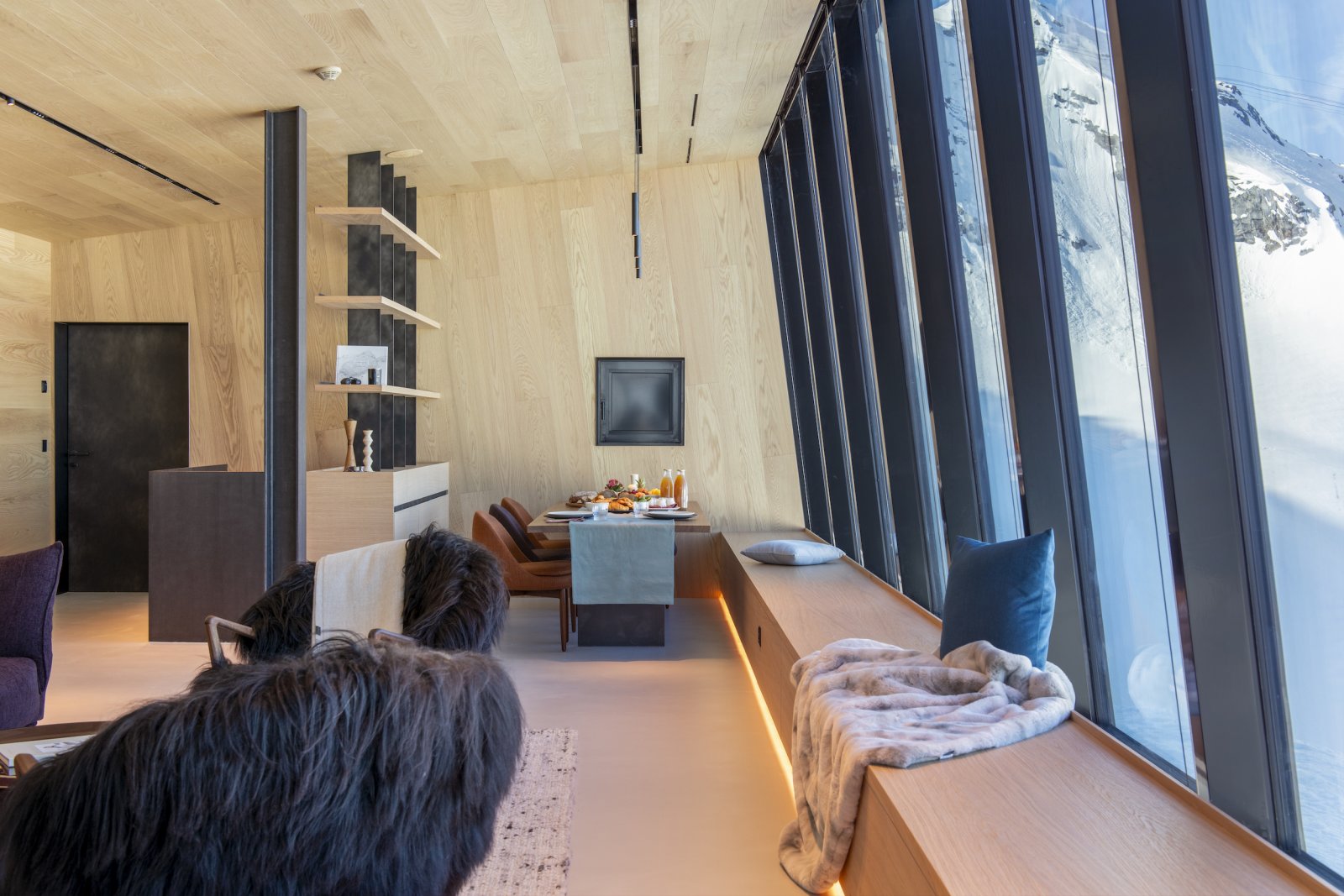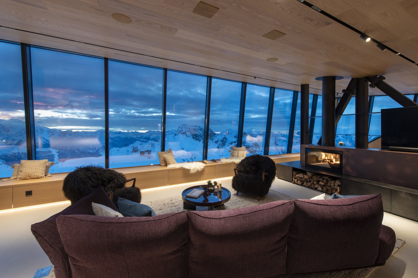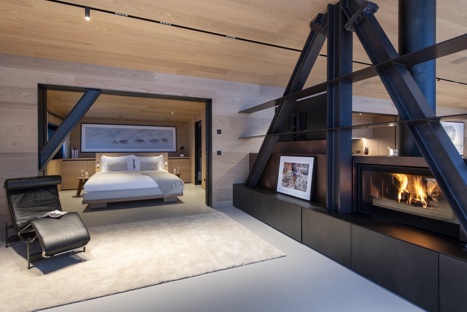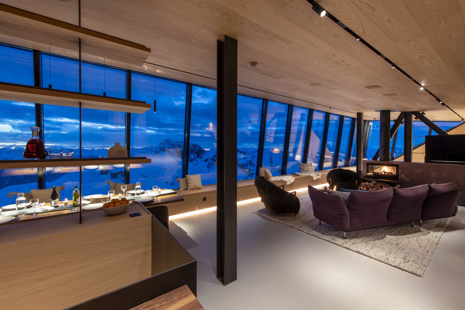 Главная комната открытой планировки является центром кабана — панорамные окна обрамляют каждую французскую вершину высотой 4000 метров. Полированные бетонные полы сочетаются с балками из восстановленной древесины; подвесной камин служит центром пространства. Интеллектуальное освещение адаптируется к оттенкам заката, а скрытые динамики транслируют музыку от джаза до сообщений о лавинах. Это одновременно и смотровая площадка, и уютное убежище.