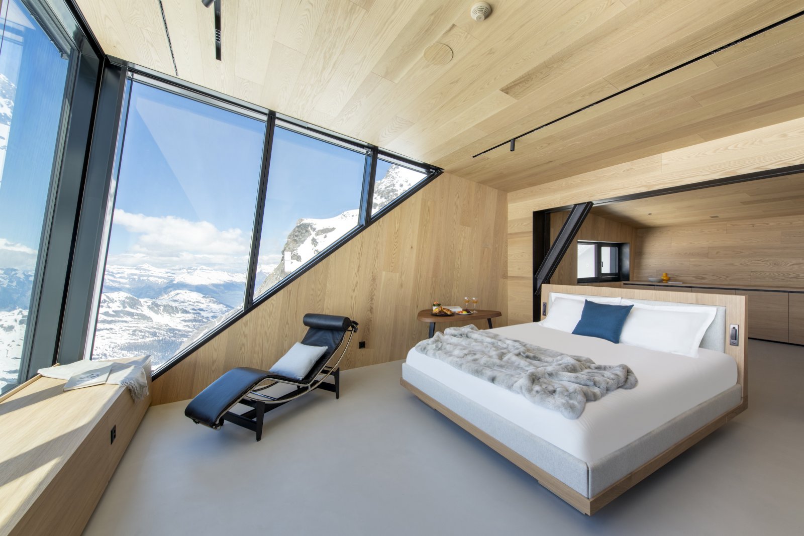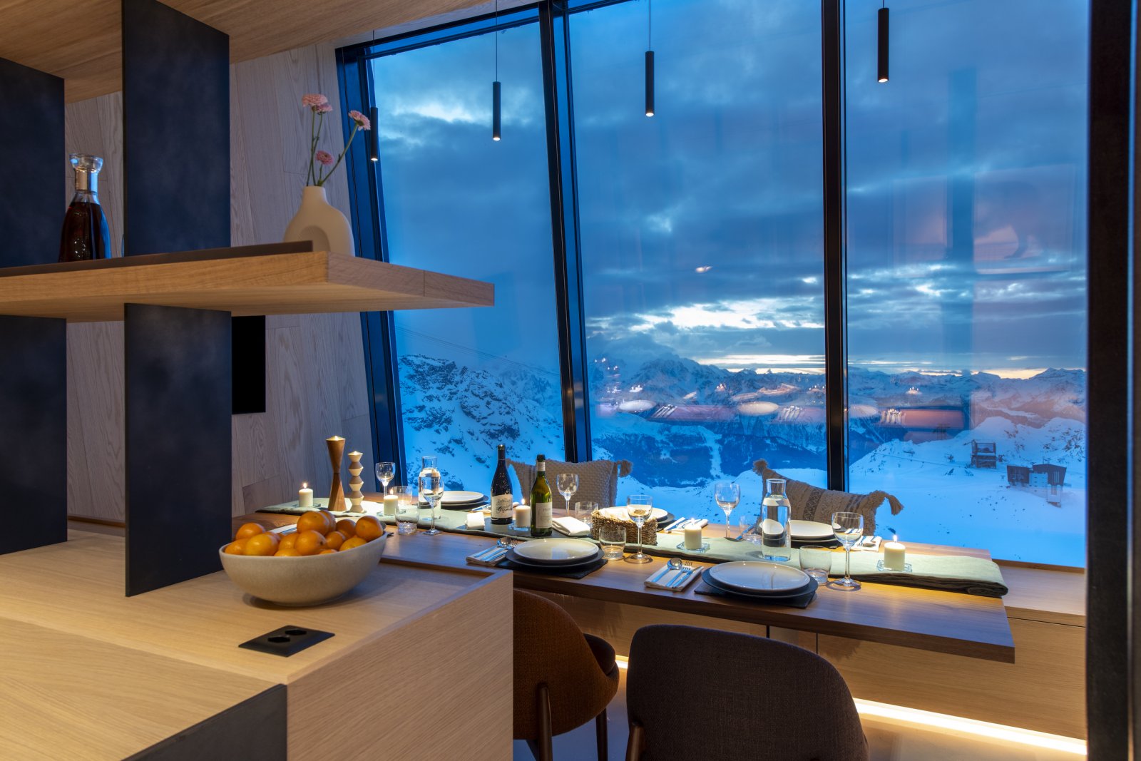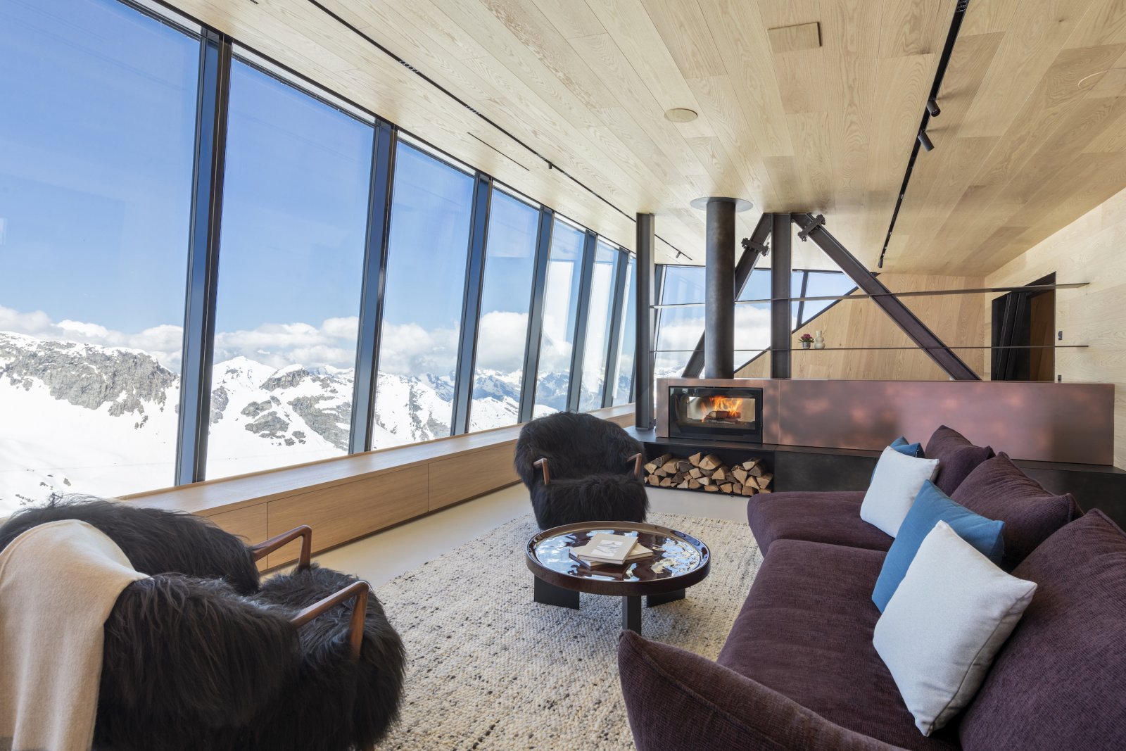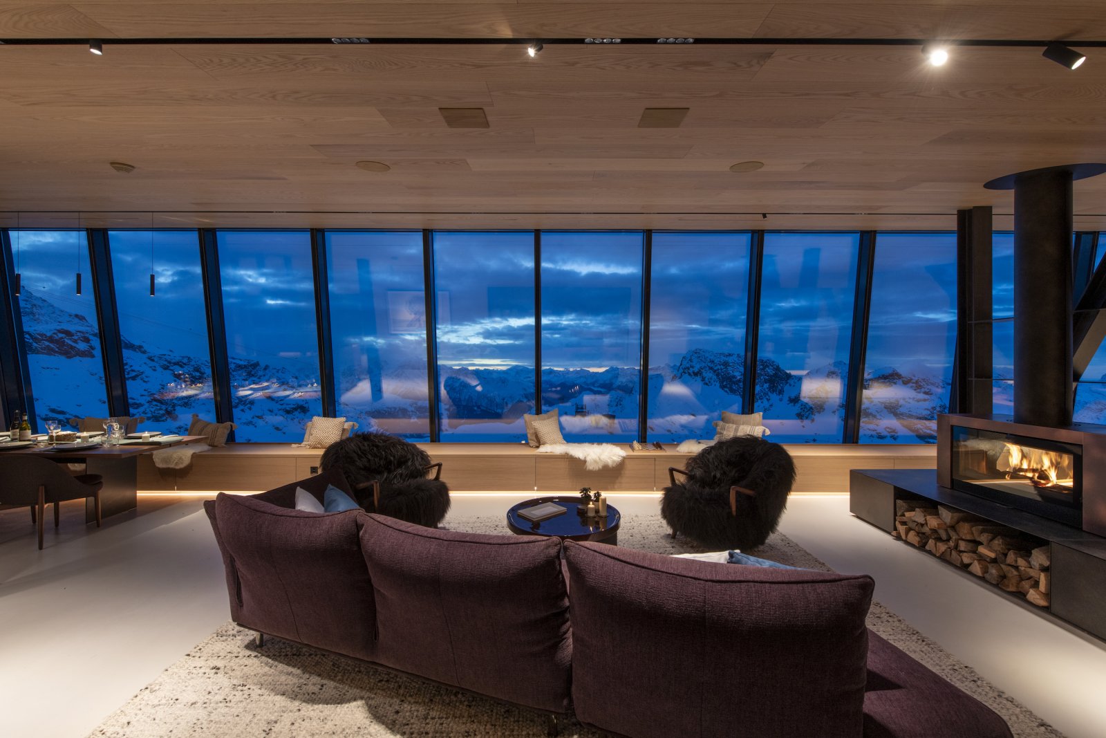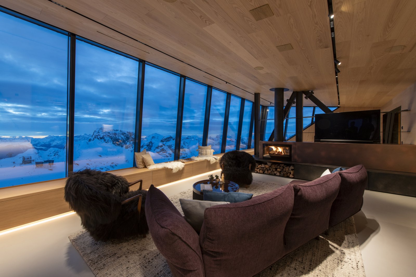 Главная комната открытой планировки является центром кабана — панорамные окна обрамляют каждую французскую вершину высотой 4000 метров. Полированные бетонные полы сочетаются с балками из восстановленной древесины; подвесной камин служит центром пространства. Интеллектуальное освещение адаптируется к оттенкам заката, а скрытые динамики транслируют музыку от джаза до сообщений о лавинах. Это одновременно и смотровая площадка, и уютное убежище.