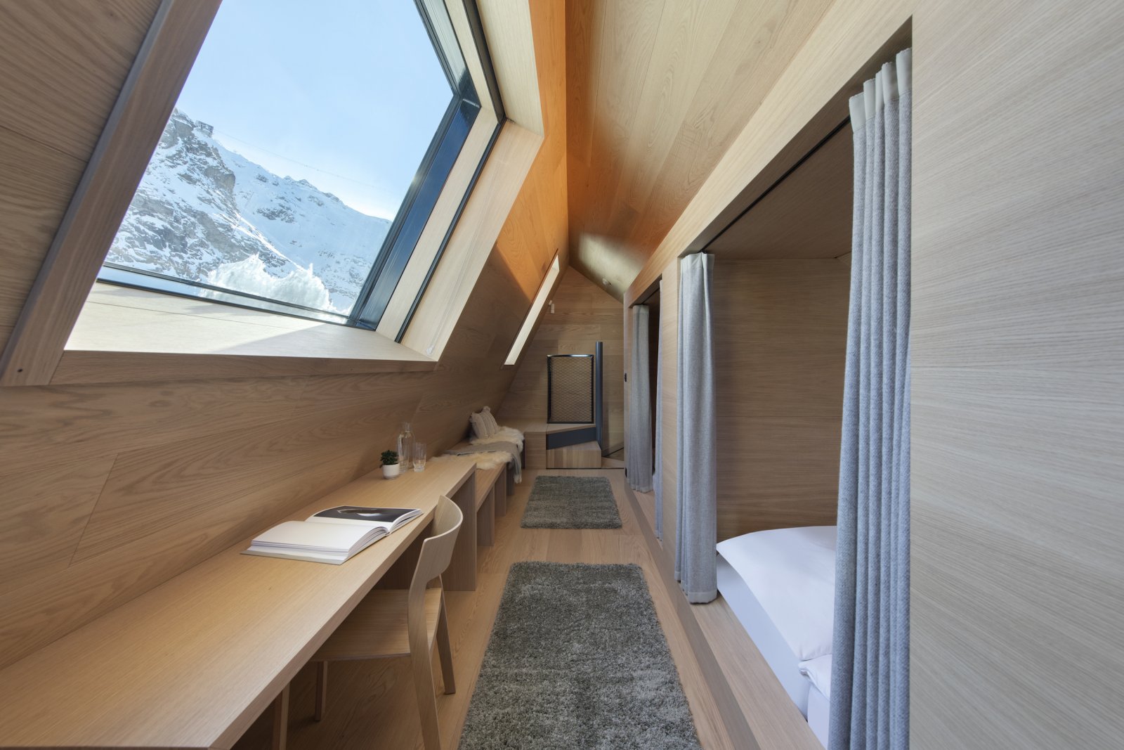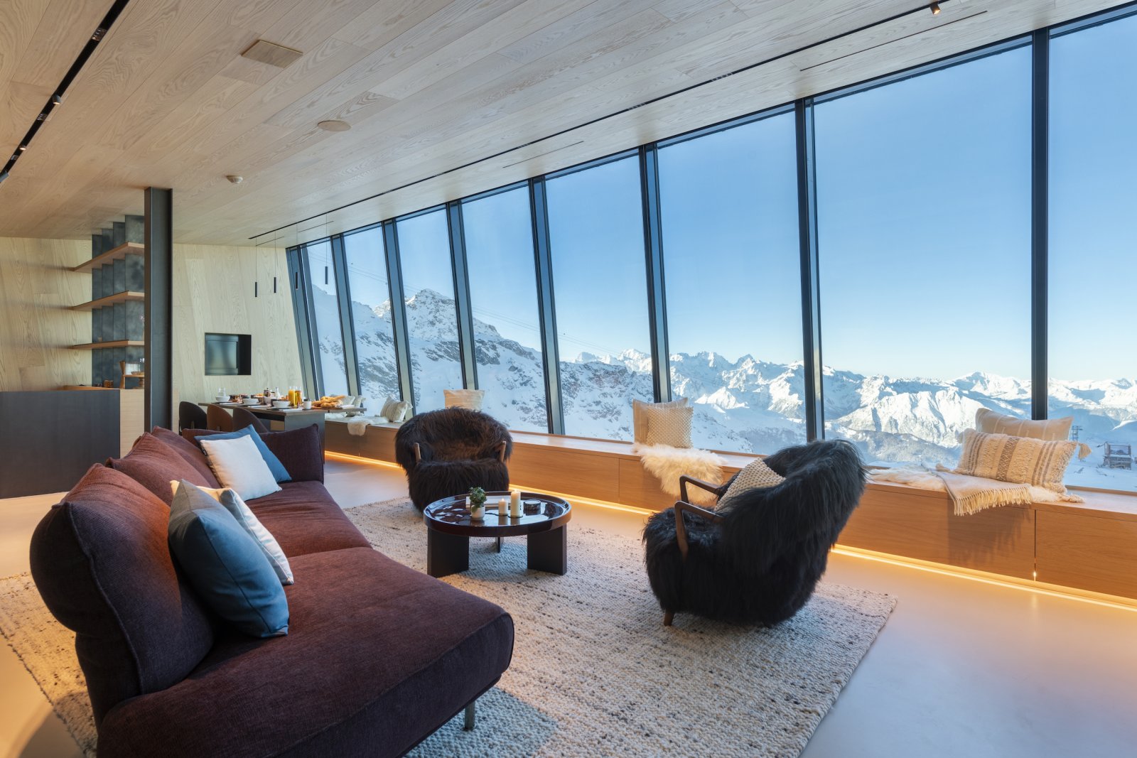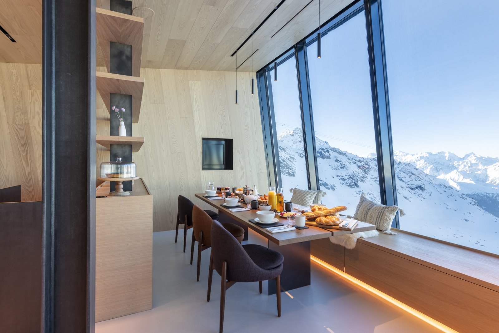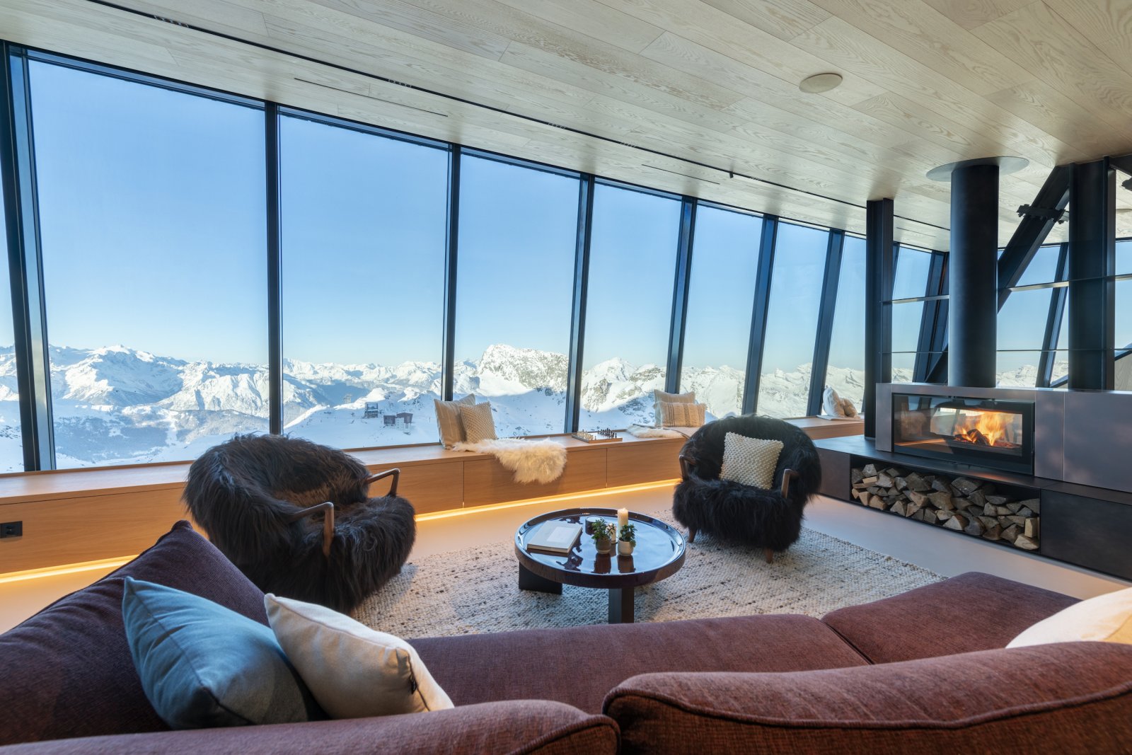 Главная комната открытой планировки является центром кабана — панорамные окна обрамляют каждую французскую вершину высотой 4000 метров. Полированные бетонные полы сочетаются с балками из восстановленной древесины; подвесной камин служит центром пространства. Интеллектуальное освещение адаптируется к оттенкам заката, а скрытые динамики транслируют музыку от джаза до сообщений о лавинах. Это одновременно и смотровая площадка, и уютное убежище.