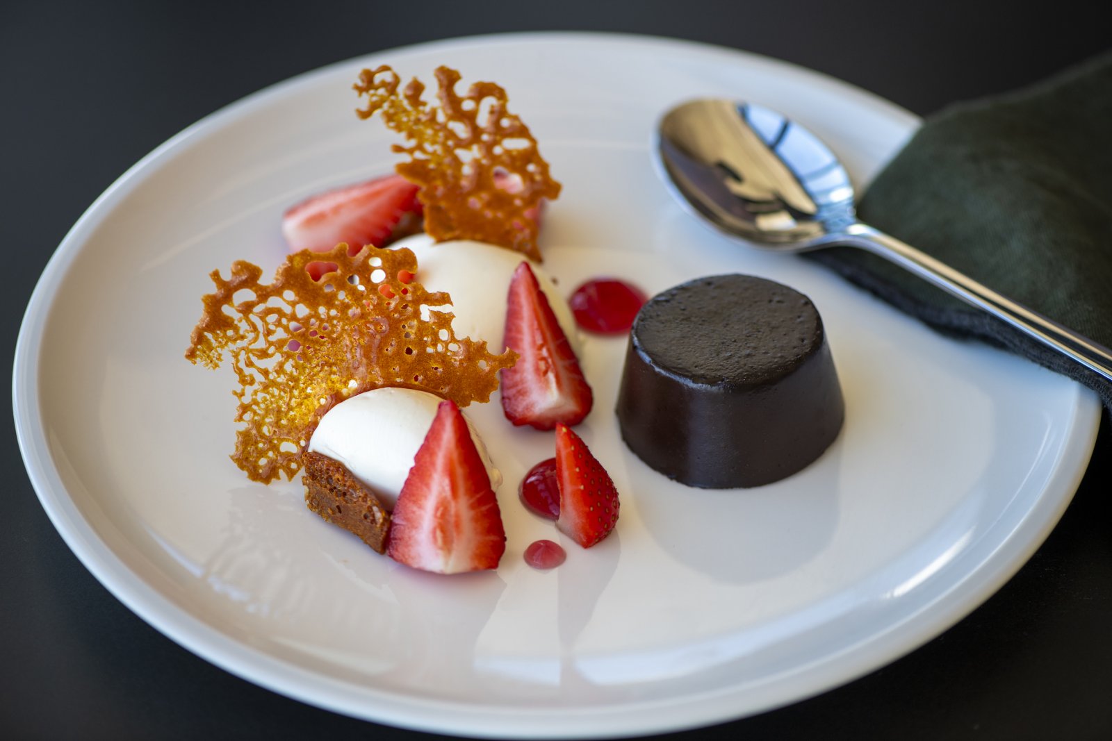 Блюда готовятся на заказ и планируются за несколько недель для каждой вечеринки. Наш шеф-повар закупает 90% продуктов в радиусе 100 км — например, валеанский ягненок, сыр грюйер и традиционные овощи с ферм долины Роны. При необходимости предлагаются детские меню. В тщательно отобранном погребе швейцарские вина сочетаются с вечерними блюдами; традиционная закуска — сабраж на террасе.