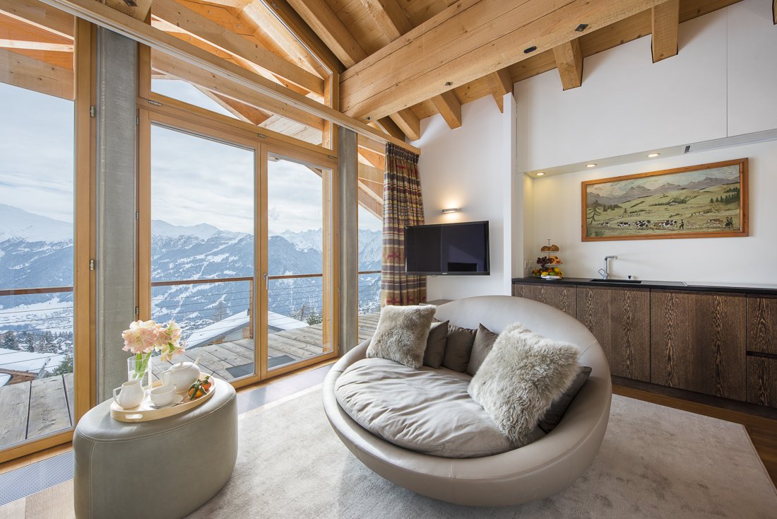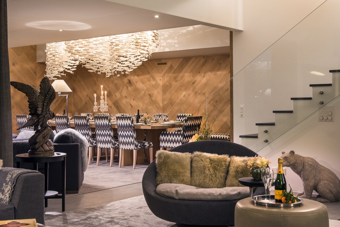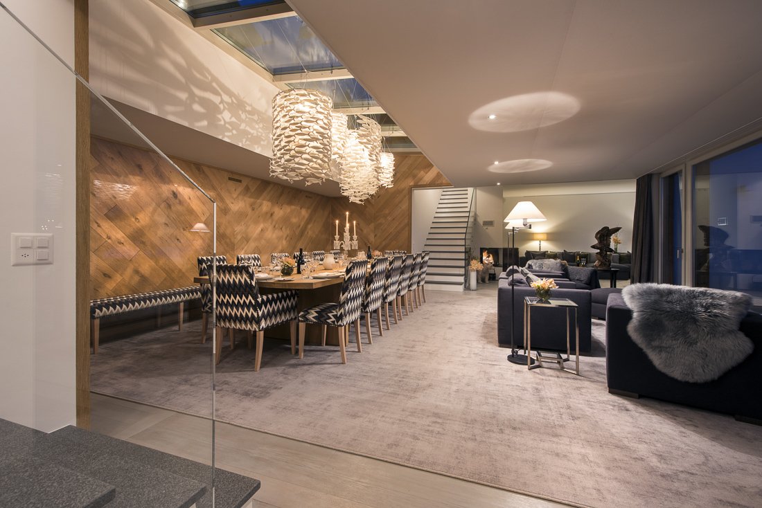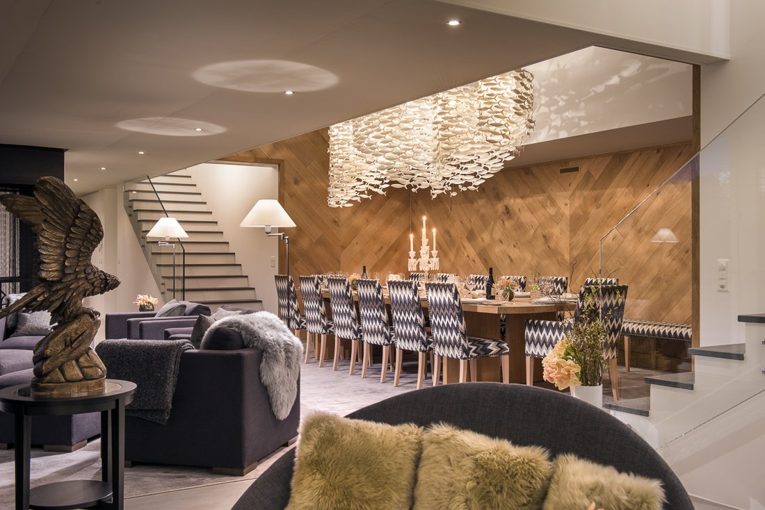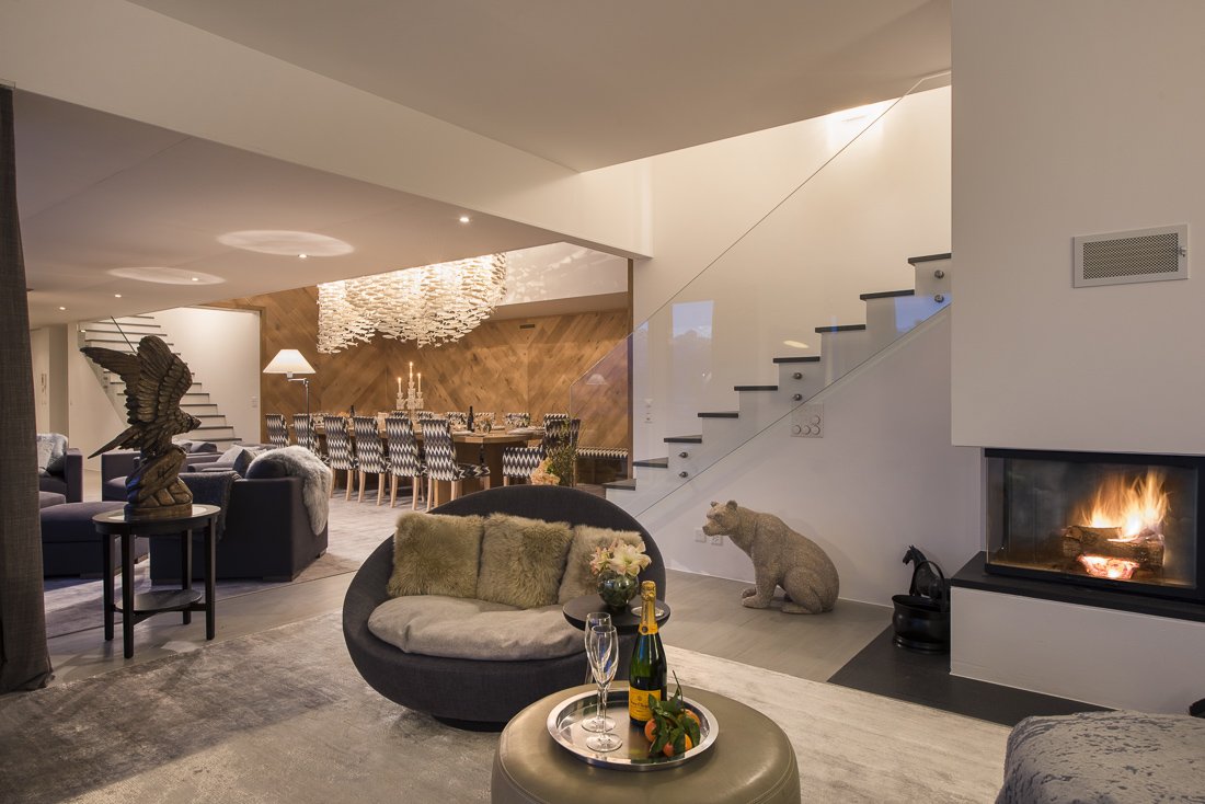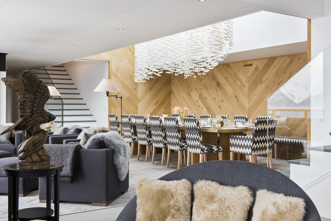Внутри шале Peregrine старинный колорит сохранен и дополнен минималистичным, но современным дизайном: открытыми балками, грубыми каменными стенами и деревянным паркетным полом в сочетании с элегантными линиями современной мебели.